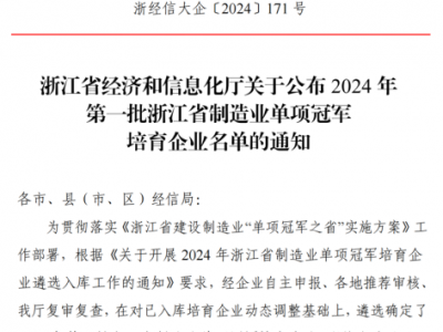 豪门国际官网入选浙江省经济和信息化厅公布的2024年第一批制造业单项冠军培育企业名单